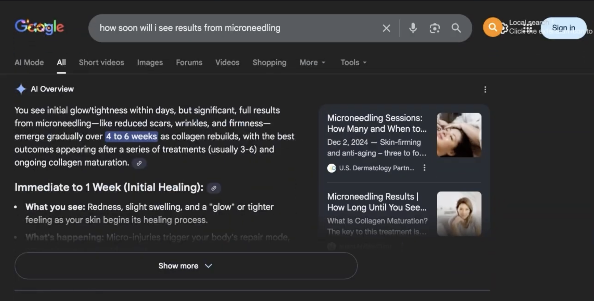 Then you have topics like “How soon will I see results from microneedling,” where there’s a good chance that you are not going to be satisfied with an AI answer: